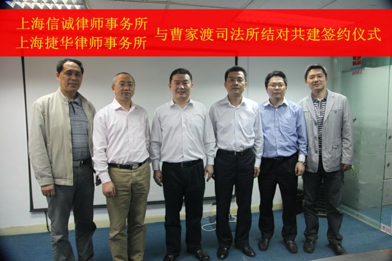 2012年5月9日,曹家渡司法所與上海市信誠律師事務所、上海市捷華律師事務所簽定了《曹家渡司法所與律師事務所結對協議書》。區司法局副局長陳敏、社區(街道)黨工委副書記、平安部部長丁有為出席了簽約儀式。根據《司法所與律師事務所結對協議書》規定,各律師事務所與司法所共同開展法律服務活動,參與社區法制宣傳,定期下社區提供法律咨詢,每月到社區舉辦法律知識講座(詳見法律講座安排表),協助調解民間糾紛、提供法律援助、擔任法律顧問以及其他法律服務等項目;司法所為律師事務所開展法律服務工作提供必要的工作條件,達到方便社區各類組織和居民通過正規渠道獲得法律幫助的目的。