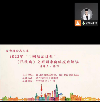 2022年, 虹口女律師完成共計八場的普法宣傳講座,并首次嘗試線上短視頻科普。此次普法宣講不同以往,除了傳統(tǒng)線下模式,還增加了線上騰訊會議的模式。為提高大家聽課的積極性,使得講課盡量生動有趣,主講律師進行了大量的前期準備工作,并結合最新的時事熱點,更貼近生活,除了對《民法典》生效后,婚姻家庭編、繼承編新規(guī)實施后有關的社會熱點案例等問題進行了深入淺出的講課,此次增加了“依法帶娃”的《家庭教育促進法》內容,同時也增加了更貼近生活的網絡維權有關內容。