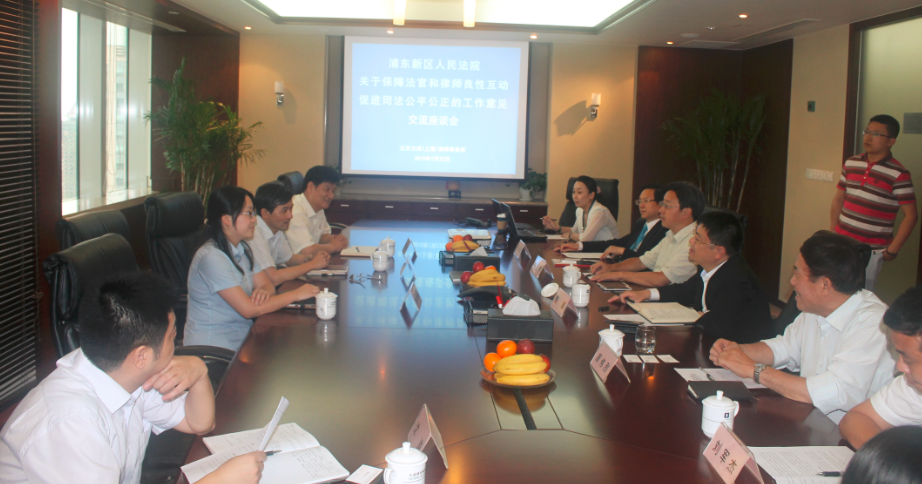 7月15日、16日和22日,浦東新區人民法院紀檢組組長衛世平等一行3人分別專程到錦天城、申達 、融孚、 大成律師事務所召開調研座談會,對擬制訂的《浦東新區人民法院關于保障法官和律師良性互動促進司法公平的工作意見》 征求律師意見。 浦東司法局副局長劉龍寶、黨組成員政治部主任陸燕萍一同調研。