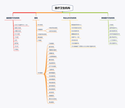 根據《醫療機構管理條例實施細則》,醫療機構的分類如下:1)綜合醫院、中醫醫院、中西醫結合醫院、民族醫醫院、專科醫院、康復醫院;2)婦幼保健院、婦幼保健計劃生育服務中心;3)社區衛生服務中心、社區衛生服務站;4)中心衛生院、鄉(鎮)衛生院、街道衛生院;5)療養院;6)綜合門診部、專科門診部、中醫門診部、中西醫結合門診部、民族醫門診部;7)診所、中醫診所、民族醫診所、衛生所、醫務室、衛生保健所、衛生站;8)村衛生室(所);9)急救中心、急救站;10)臨床檢驗中心;11)專科疾病防治院、專科疾病防治所、專科疾病防治站;(12)護理院、護理站;(13)醫學檢驗實驗室、病理診斷中心、醫學影像診斷中心、血液透析中心、安寧療護中心;(14)其他診療機構。