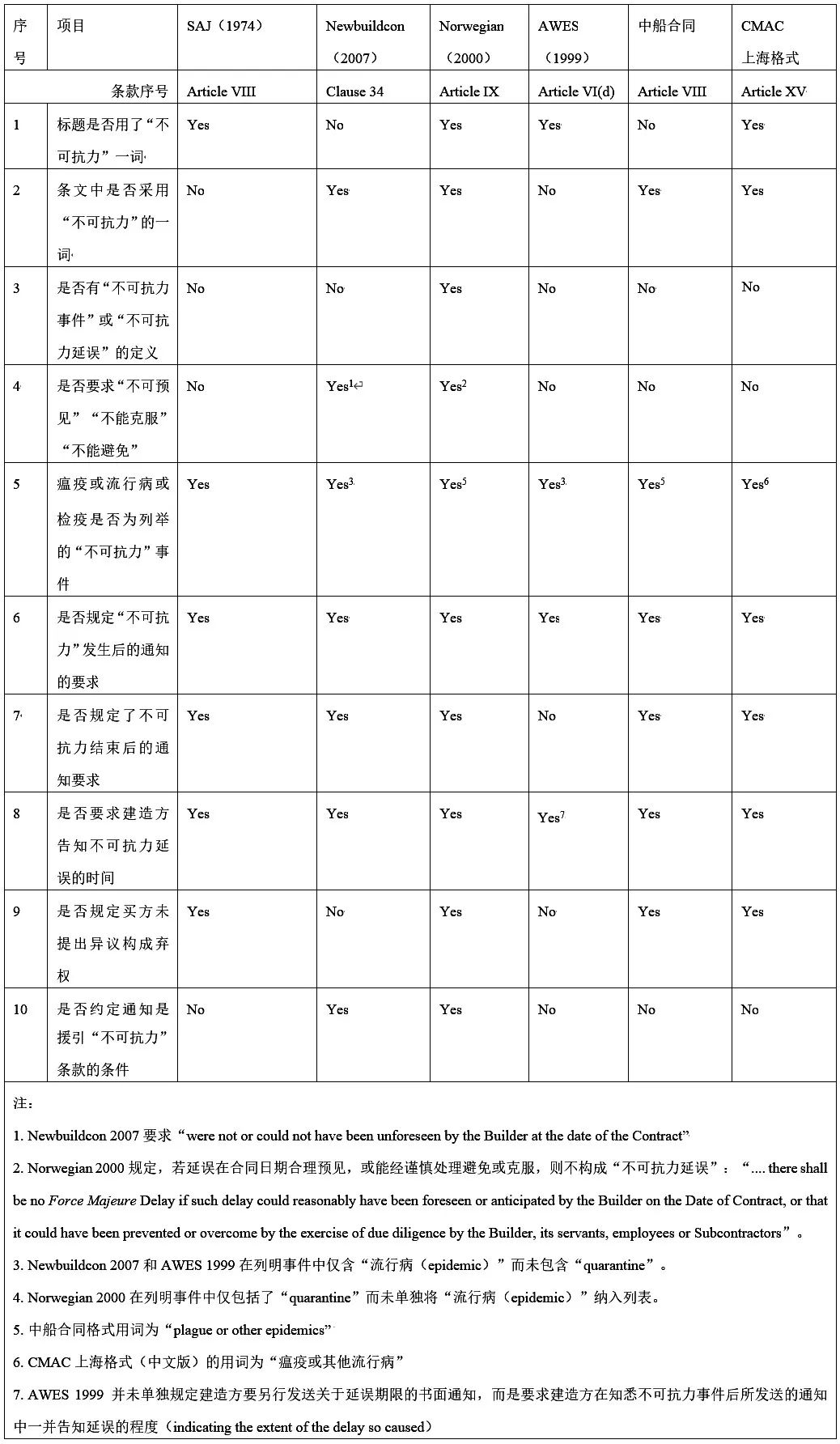 本文選擇了以下常見國際造船合同格式,并選取其中幾項主要因素加以對比,以最大程度反映不同合同格式“不可抗力”條款之間的差異與各自特征,具體參下表:
