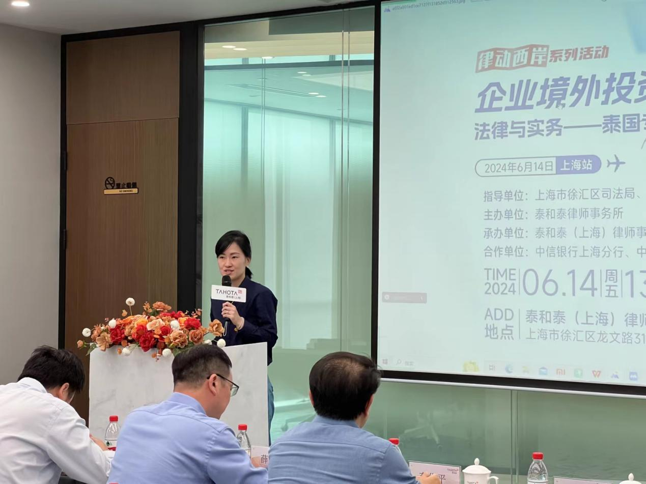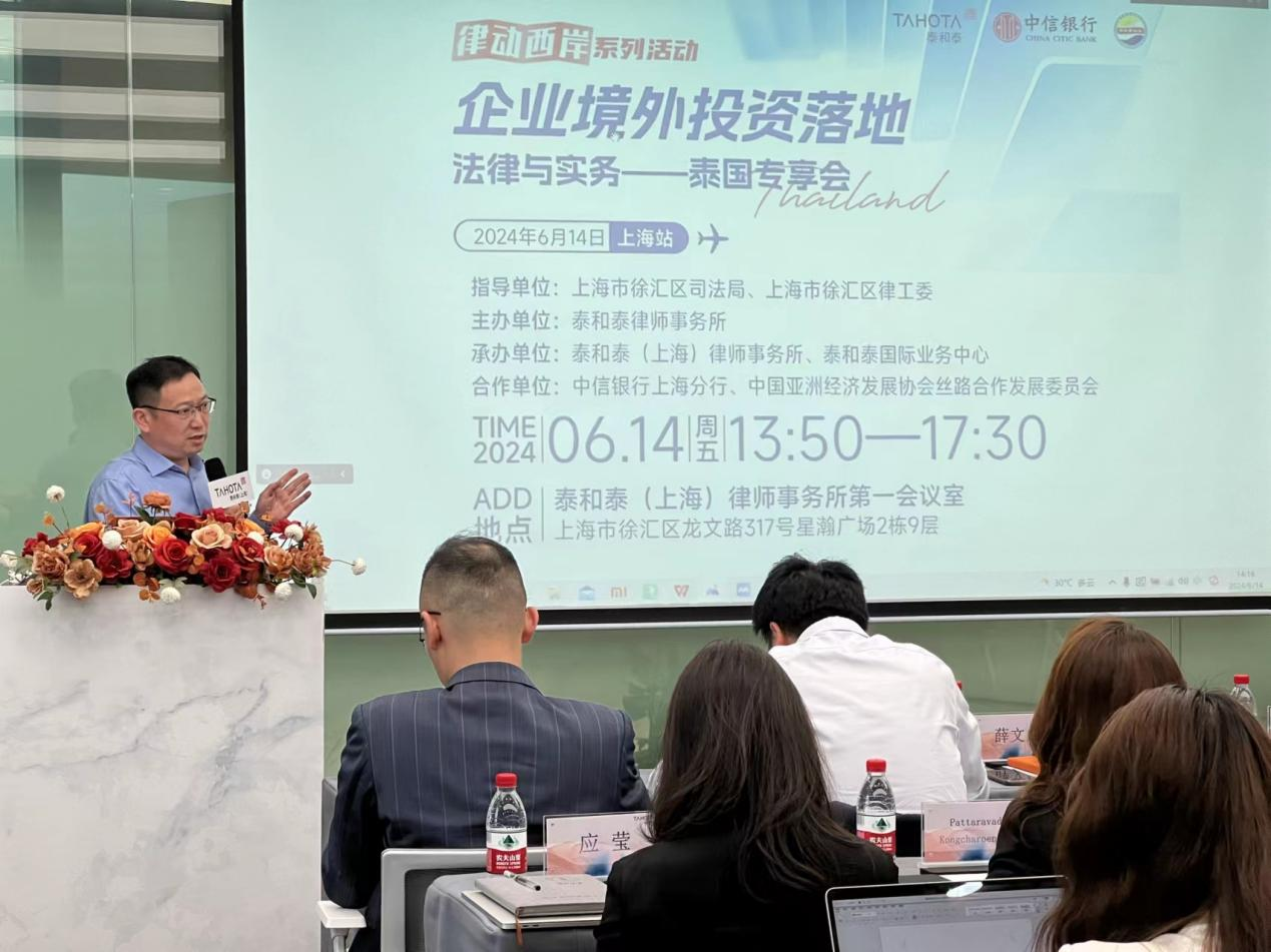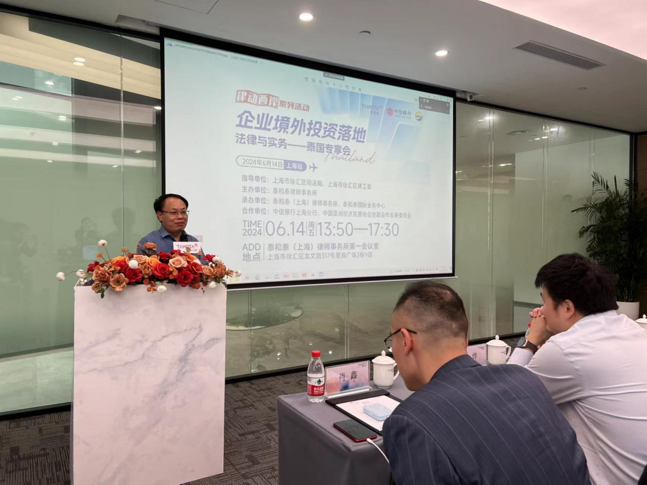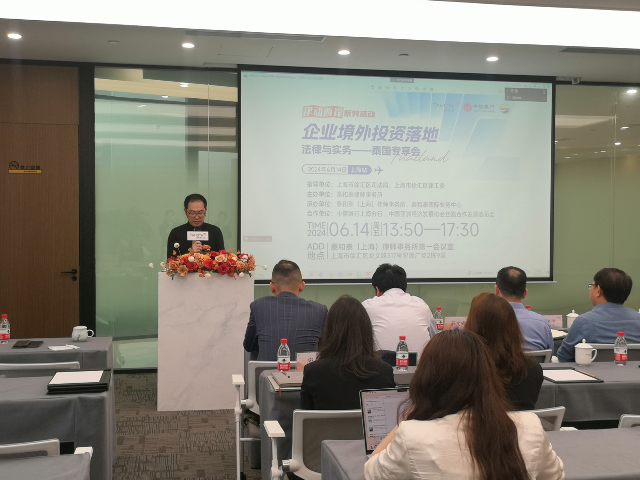 2024年6月14日下午,由徐匯區司法局、徐匯律工委作為指導單位,泰和泰律師事務所主辦,中信銀行上海分行、中國亞洲經濟發展協會絲路合作發展委員會提供大力支持的“企業境外投資落地法律與實務——泰國專享會”在泰和泰律師事務所上海辦公室第一報告廳成功舉辦,該活動作為律動西岸系列活動之一,旨在共同探討在“一帶一路”倡議大背景下企業投資泰國的機遇與挑戰,并交流在泰國投資的實務經驗。