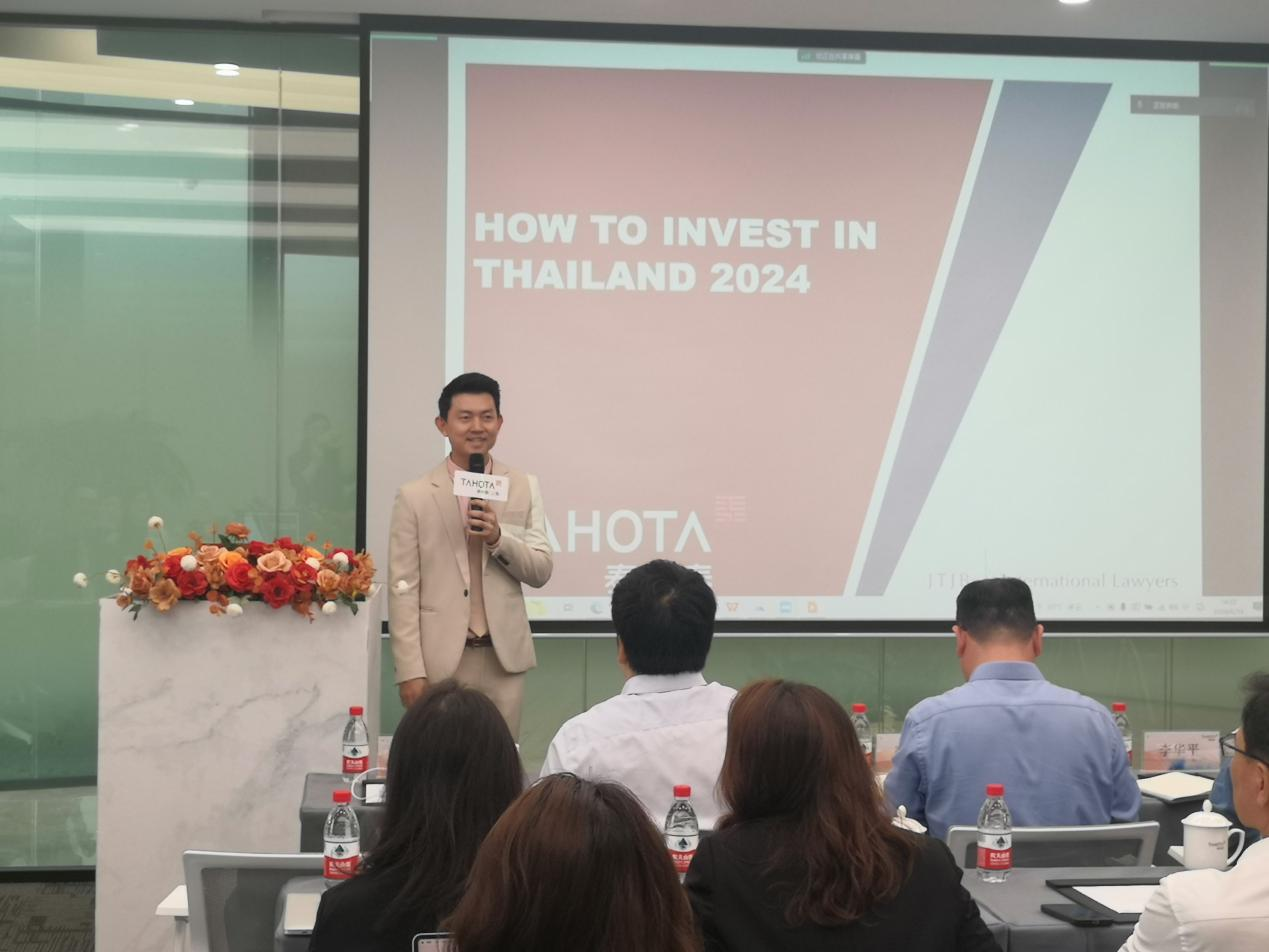分享會正式進入研討環節,首先,泰和泰(曼谷)律師事務所董事、JTJB International Lawyers Partner合伙人Bunnasomboon Chaiparinya律師和泰和泰律師事務所合伙人干建明律師以”How to do business in Thailand 如何在泰國開展投資業務 (2024)”為主題,通過中英雙語向嘉賓詳細介紹了泰國的商業概況、投資環境、投資管理部門設置、投資法律與政策,并以泰國公司組織形式為例,為外國投資者在泰國設立公司和開展商業經營提供了相關的建議。