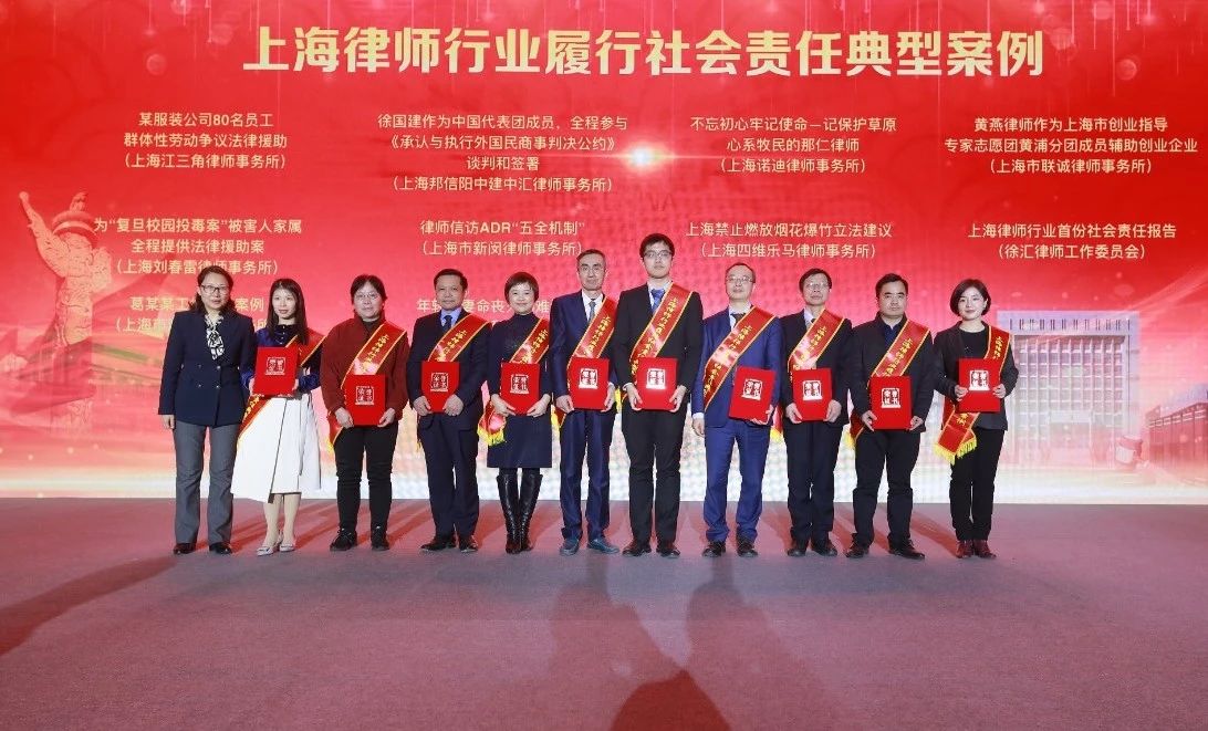 2020年1月2日下午,在錦江小禮堂舉行的“紀念律師制度恢復重建40周年大會”上,向首屆上海律師履行社會責任主題宣傳活動評選出的“上海律師行業公益之星”“上海律師行業履行社會責任先進集體”以及“上海律師行業履行社會責任典型案例”獲得者個人及集體進行了頒獎。這也標志著為期3個月的首屆上海律師履行社會責任主題宣傳活動落下帷幕。