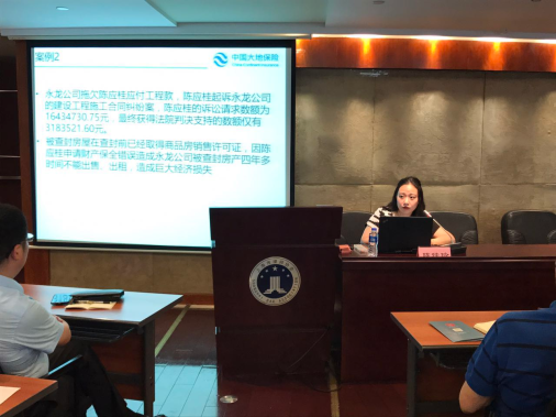 2017年6月6日, 市律協保險業務研究委員會與 市保險學會、市保險同業公會在市律協報告廳聯合舉辦主題為“訴訟保全責任險風險探析”的業務講座。此次講座邀請了中國大地財產保險股份有限公司上海分公司虹口支公司總經理助理陳佳玲女士作為主講嘉賓,市律協保險業務研究委員會主任周波律師主持。上海市保險學會、市保險同業公會副秘書長伍國良先生出席會議。100多名保險專家、律師參加了本次講座。