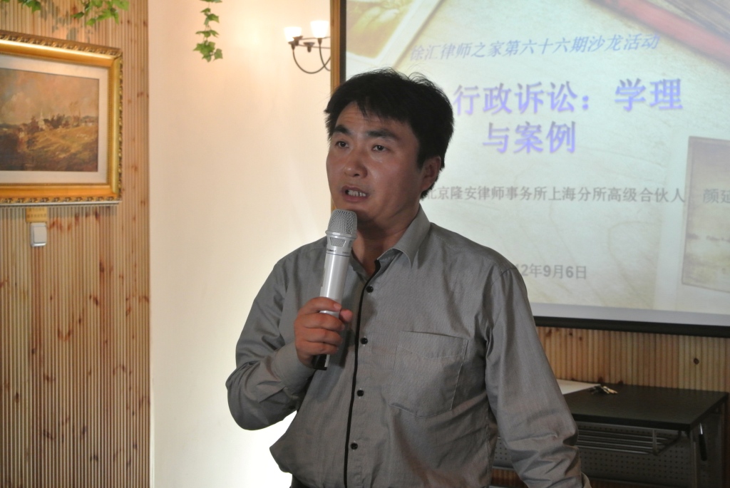 2012年9月6日下午,徐匯律師之家舉行了稅務行政訴訟:學理與案例沙龍活動,北京隆安律師事務所上海分所合伙人顏延律師作為主講嘉賓出席沙龍活動,與到場的律師就稅務行政訴訟案件的熱點和特殊法律問題分享自己的從業心得。副局長朱志忠出席沙龍活動。