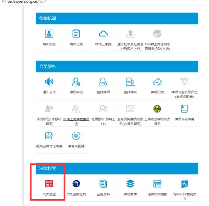 本市律師會員(不包括實習律師),可通過個人會員賬號登錄東方律師網(wǎng)會員中心,在法律檢索欄目“北大法寶”模塊點擊進入。(如下圖示)