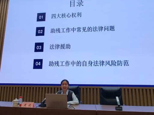 在授課中,周曉律師憑借專業(yè)功底與生動(dòng)案例,將法律條文轉(zhuǎn)化為易懂的工作方法,深入剖析殘疾人康復(fù)教育、勞動(dòng)就業(yè)、社會(huì)保障、無(wú)障礙環(huán)境四大核心權(quán)利的法律依據(jù),針對(duì)基層工作中高頻出現(xiàn)的監(jiān)護(hù)人認(rèn)定、民事訴訟程序、法律援助申請(qǐng)等問(wèn)題逐一拆解,為基層工作者提供清晰處理路徑。同時(shí),她還特別強(qiáng)調(diào)助殘工作者自身法律風(fēng)險(xiǎn)防范要點(diǎn),助力學(xué)員精準(zhǔn)規(guī)避履職風(fēng)險(xiǎn),依法維護(hù)殘疾人合法權(quán)益。既提升了助殘工作者的法律素養(yǎng)與業(yè)務(wù)能力,更強(qiáng)化了他們依法助殘、規(guī)范履職的責(zé)任意識(shí)。