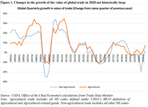 2007-2008年金融風暴打亂了國際貿易,農產品國際貿易也隨之下挫,全球饑餓人口飆升至10億,這期間沒有發生重大自然災害。2019-2020年新冠疫情爆發,國際貿易再受重挫,但食用農產品國際貿易很快恢復過來,呈一枝獨秀狀態,最重要的是,未出現大規模饑餓現象。下圖來自美國農業部,虛線代表非農業,實線代表農業,可見2008年農產品國際貿易和非農產品國際貿易均下挫,2020年僅非農產品下挫,農產品很快恢復上揚。新冠疫情條件下,農業國際貿易的成功表現,使其成為研究對象。相關研究顯示,主要有以下因素。