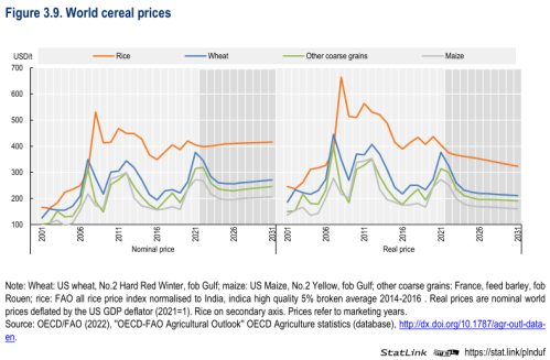 2008年饑荒中,小麥價格有顯著上漲,但遠不及米價漲幅。下圖來自經合組織和世界糧農組織2022年出版的《農業展望》,世界谷物價格采樣中,小麥價格采用的美國小麥價格,大米價格采用印度大米,左圖是預測右圖是實際,可見在2008年,小麥價格漲幅比大米溫和很多。
