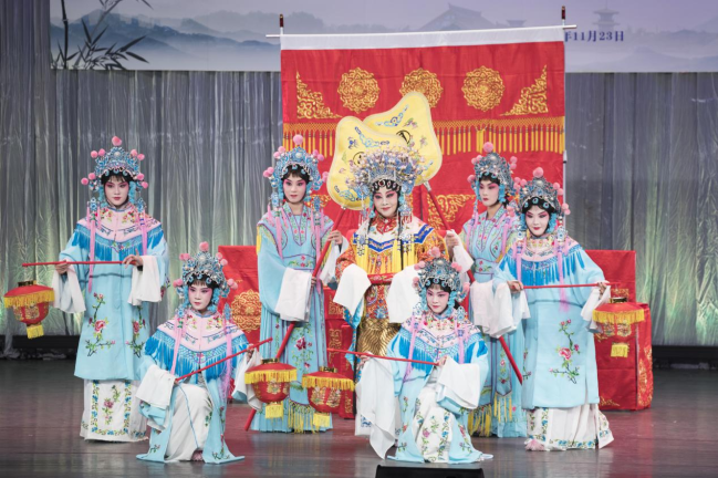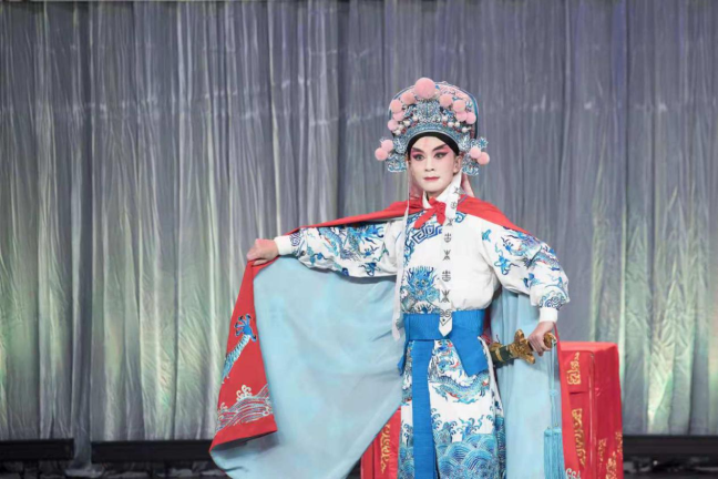 款款京胡聲中,市律協原副秘書長劉小禾緊接著上臺,帶來了張派名劇《望江亭》選段。這出戲是張君秋先生的代表作,劉老師自學之外又請了京劇院的蔡筱瀠為其指導。只見她一襲紅色演出服,儀態雍容,氣質端莊;嗓音甜美,行腔綺麗多變,帶給了觀眾很好的藝術享受。黃綺律師表演的程派《龍鳳呈祥》唱段,扮相華麗,在六個配演宮女眾星拱月的襯托下,一出場就使人眼前一亮。而沉郁凝重的程腔,更是與張派、梅派的風格截然不同,使得觀眾“如聞仙樂耳暫明”,沉浸在一派深邃悠遠的程腔秋韻之中。在觀眾的掌聲中,錢麗萍律師再次登臺,帶來了《法場換子》,不溫不火的做派,沉穩老練的臺風,將劇中人“徐策”演繹得相當完美。