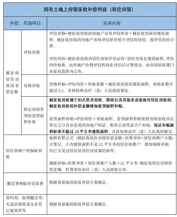 國有土地上房屋:征收居住房屋的,應(yīng)當(dāng)根據(jù)不同情況,給予被征收人、公有房屋承租人以下補償、補助:(1)被征收房屋的房地產(chǎn)市場評估價格;(2)價格補貼;(3)特定房屋類型的套型面積補貼;(4)居住困難戶的保障補貼;(5)搬遷費和臨時安置費。此外,對按期簽約、搬遷的被征收人、公有房屋承租人,房屋征收部門應(yīng)當(dāng)給予獎勵,具體獎勵標準由各區(qū)(縣)人民政府制定,一般包括:(1)簽約獎;(2)按期搬遷獎;(3)無違法建筑或無未登記建筑獎等。