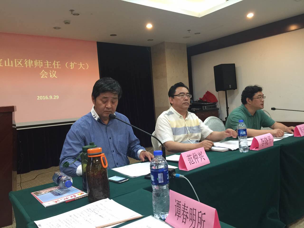 2016年9月29日下午,上海市寶山區律工委、律師黨總支寶山區律所主任擴大會議在寶山隆重召開。寶山區律工委全體成員、寶山區律市黨總支成員、寶山區各律師事務所主任包括部分律師事務所副主任、合伙人出席會議。市律協鄒甫文副會長出席會議,出席會議的寶山區司法局領導有:分管律師工作副局長李曉平。會議由律工委主任范仲興、公律科科長兼律師黨總支書記黃云峰共同主持。