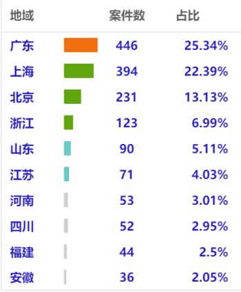 (1)會展合同履行糾紛案件主要集中在經濟活躍度較高、會展業發展較快沿海省份直轄市,如廣東、上海、北京、浙江等地,但數據顯示河南、四川、安徽等省份也有一定的案件量,充分說明這些內陸省份的會展業在這些年有了明顯發展,也反映了這些地區經濟轉型加快及發展提速的實際狀況。