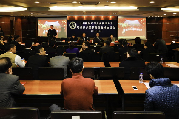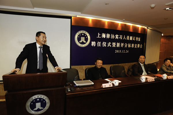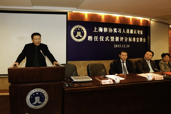 為感謝律師考官們對市律協工作的支持與理解,上海律協于2015年12月24日,在35樓報告廳舉行首次實習人員面試考官聘任儀式。市律協會長俞衛鋒、副會長兼考核委主任呂琰、市司法局律管處副處長葉林、市律協副秘書長陳東出席儀式。