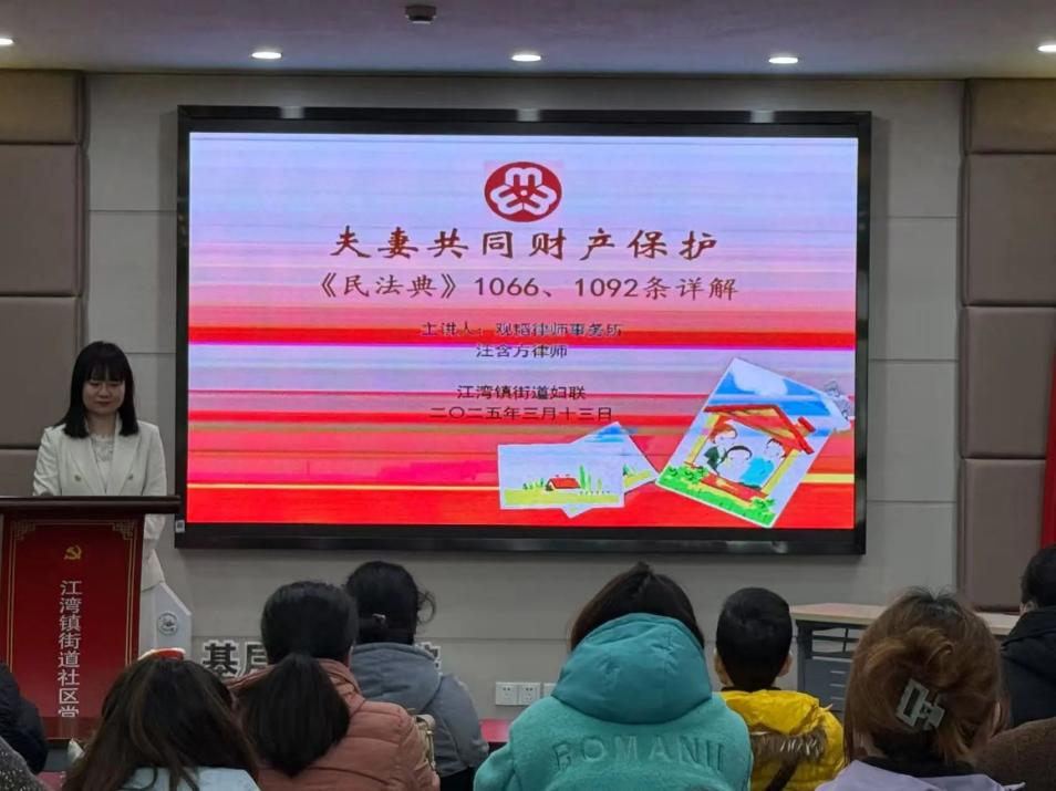 3月13日,北京觀韜中茂(上海)律師事務所汪含方律師受江灣鎮(zhèn)街道婦聯(lián)的邀請,以《夫妻共同財產保護——民法典1066、1092條詳解》為主題,為居民區(qū)婦聯(lián)主席及巾幗志愿者們帶來一場普法講座。汪律師以法條與案例相結合的方式詳細為大家解讀了《民法典》中關于夫妻共同財產的知識點,同時為聽眾們科普了如何更好的保護夫妻共同財產、維護自身合法權益。