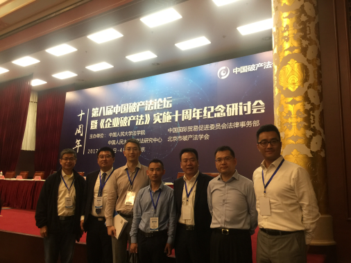 2017年6月3日、4日,“第八屆中國破產法論壇暨《企業破產法》實施十周年紀念研討會”北京市友誼賓館召開。本次會議由中國人民大學法學院、中國國際經濟貿易促進委員會法律事務部、中國人民大學破產法研究中心、北京市破產法學會共同主辦。市律協破產清算業務研究委員會由副主任郝朝暉、朱小蘇帶隊,委員王保國、孫迎超、秦秉蔚、倪志剛等律師參加了本次論壇。來自北京、上海、江蘇、浙江、山東、湖南、四川、山西、廣西等地高校科研系統、法院系統、政府和金融系統、律師及會計師等管理人系統共計800余位專家學者參加。