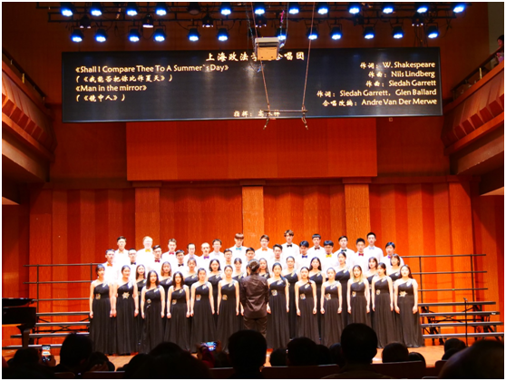 上海政法大學合唱團的同學們的表演形式也讓人耳目一新。他們用混聲的方法,演繹了《Shall I compare thee to a summer’s day》(我能否把你比作夏天)和《man in the mirror》(鏡中人)二曲。其中,《Shall I compare thee to a summer’s day》(我能否把你比作夏天)的歌詞來源于英國詩人莎士比亞的十四行詩第十八首,歌曲唯美浪漫。《man in the mirror》(鏡中人)是美國最富盛名的已故流行天王邁克爾杰克遜的歌曲,表達了從自身做起,改變世界的主題。