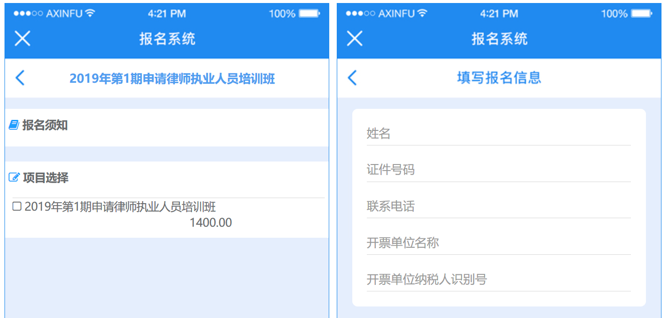 3、根據提示補全相關信息:(1)開具單位抬頭的,請同時填寫單位納稅人識別號(即“稅號”);(2)開具發票抬頭為個人或本人姓名的,僅需填寫開票單位,納稅人識別號一欄內,填寫“無”;(3)請各位學員發票單位信息時填務必認真,如學員填寫時有誤,請在辦班后一周內聯系班主任更改。按照學員填寫信息開具的發票,一經開具不予更換。