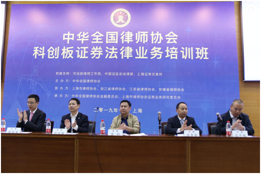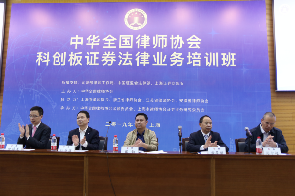 2019年10月19日,在習(xí)近平主席宣布在上海設(shè)立科創(chuàng)板并試行注冊制一周年到來之際,由中華全國律師協(xié)會主辦、上海市律師協(xié)會、浙江省律師協(xié)會、江蘇省律師協(xié)會、安徽省律師協(xié)會協(xié)辦,中華全國律師協(xié)會金融委員會、上海律協(xié)證券業(yè)務(wù)研究委員會承辦的“科創(chuàng)板證券法律業(yè)務(wù)培訓(xùn)班”在上海交通大學(xué)凱原法學(xué)院東方會堂報告廳舉行。這次培訓(xùn)班得到了司法部律師工作局、中國證監(jiān)會法律部、發(fā)行部和上海證券交易所的大力支持。