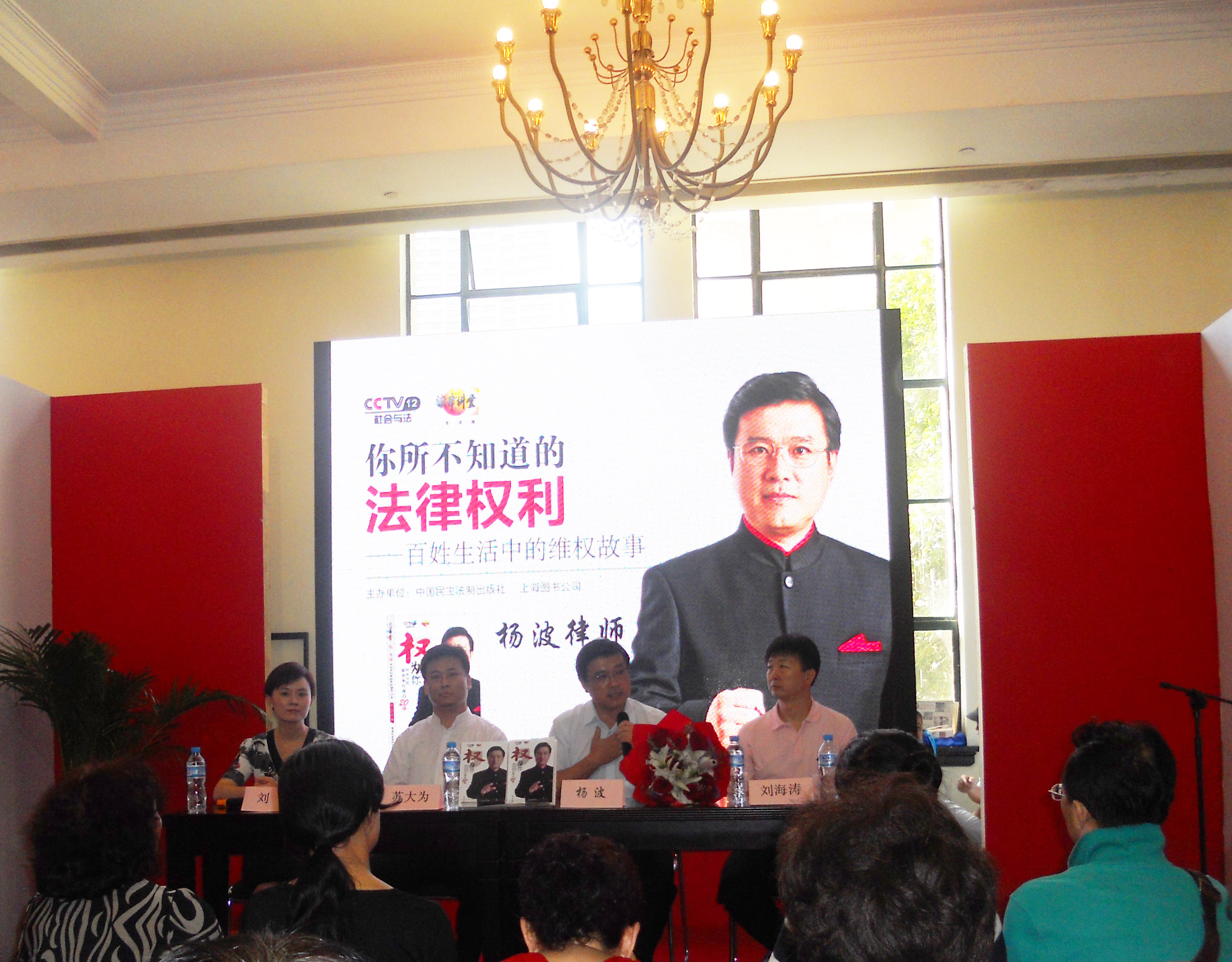 2012年8月16日下午,上海書展開幕第二天,中央電視臺社會與法頻道CCTV12《法律講堂》主講人楊波律師新作《權,為你》讀者見面會在上海展覽中心人文藝術館舉行。活動由首屆全國公訴人與律師電視論辯大賽最佳辯手劉一律師擔任嘉賓主持。當天上午剛結束大佳網視頻專訪的楊波律師與特邀嘉賓中國民主法制出版社副總編輯劉海濤、中央電視臺《法律講堂》欄目副制片人蘇大為,出席讀者見面會并簽名售書。盡管當日酷暑難耐,但活動仍吸引了眾多讀者和媒體朋友,更有忠實讀者從江蘇等地早早趕到活動現場一睹楊波律師的風采。