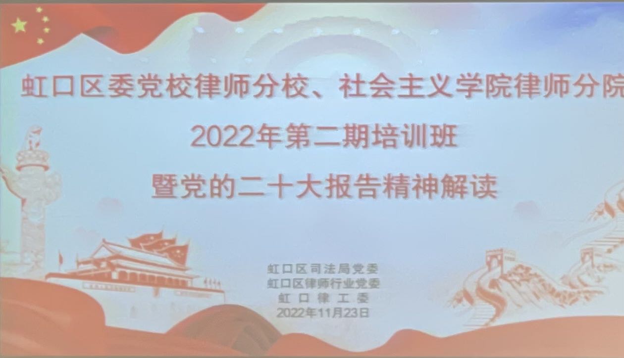 11月23日,由虹口區司法局、區律師行業黨委、區律工委聯舉辦的2022年第二期培訓班暨黨的二十大報告精神解讀,于11月23日在區律師黨校、社會主義學院律師分院開班。