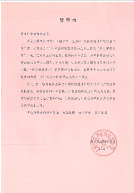 4年間,黃浦區女律聯為區婦聯貢獻智慧,不斷磨合,為黃浦區的婦女、兒童權益保護,法治宣傳做出了貢獻,區婦聯為感謝黃浦區女律聯、女律師們的辛勤付出,特寄感謝信。