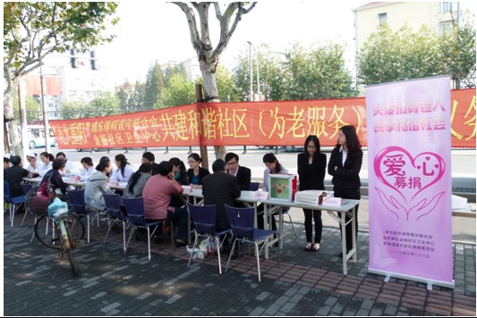 九九重陽,殷殷敬老,2012年10月23日,全國(guó)迎來了第二十五個(gè)敬老節(jié)。上午9點(diǎn),浦東律師青年聯(lián)合會(huì)、金楊社區(qū)衛(wèi)生中心、浦東律師團(tuán)委——“九九重陽“共建和諧社區(qū)(為老服務(wù))法律、健康義務(wù)咨詢?nèi)栈顒?dòng)在浦東金楊社區(qū)的云山路上舉行。來自融孚、中倫、協(xié)力、永樂、公民等多家律所的青年律師們以及金楊衛(wèi)生中心多個(gè)科室的醫(yī)生代表們分別在浦東律師青年聯(lián)合會(huì)主席呂琰律師、衛(wèi)生中心陳利云主任的帶領(lǐng)下積極參與了此次法律、健康咨詢。浦東新區(qū)司法局副局長(zhǎng)、律師黨委書記姚建國(guó),司法局律公處處長(zhǎng)趙開銀,團(tuán)區(qū)委書記助理、浦東青聯(lián)秘書長(zhǎng)沈聰?shù)瘸鱿顒?dòng)并講話,新區(qū)人大領(lǐng)導(dǎo)穆燕萍、金楊街道主任王華到現(xiàn)場(chǎng)慰問。