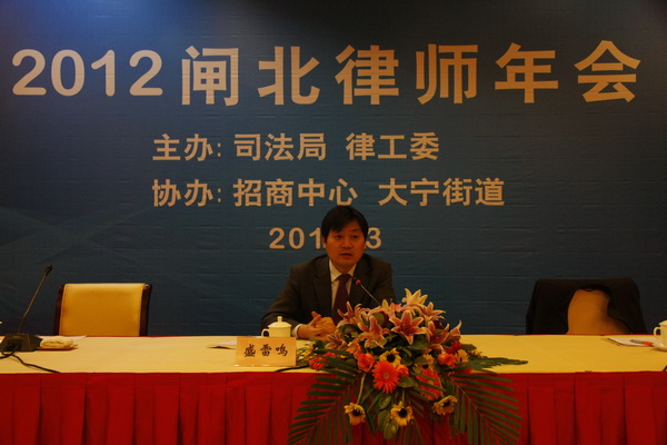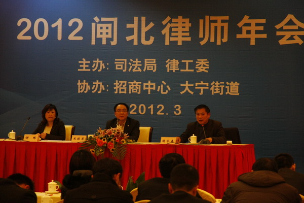3月2日下午,在“給力社會和諧 聚力轉型發展——閘北區2012律師年會”上,市律師協會盛雷鳴會長、大寧街道胡長春主任、區招商中心謝瑋副主任分別作了律師行業發展的專題講座和閘北區招商引資情況專題介紹。會議由區司法局米振榮局長主持。會后,全體與會人員圍繞主題開展了分組討論。