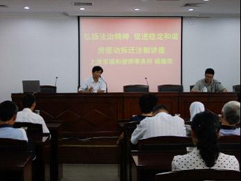 2012年是全面實施“六五”普法規(guī)劃的關鍵一年。為深入貫徹落實科學發(fā)展觀,堅持依法治國方略,大力弘揚法治精神,推進廟行地區(qū)的法制宣傳教育工作,為經(jīng)濟平衡健康發(fā)展和社會和諧穩(wěn)定營造良好的法治環(huán)境。2012年9月26日下午,上海市瑞和律師事務所楊振榮主任應廟行司法所邀請,為廟行地區(qū)居民就房屋動拆遷中涉及到的法律知識作了一場法制講座。