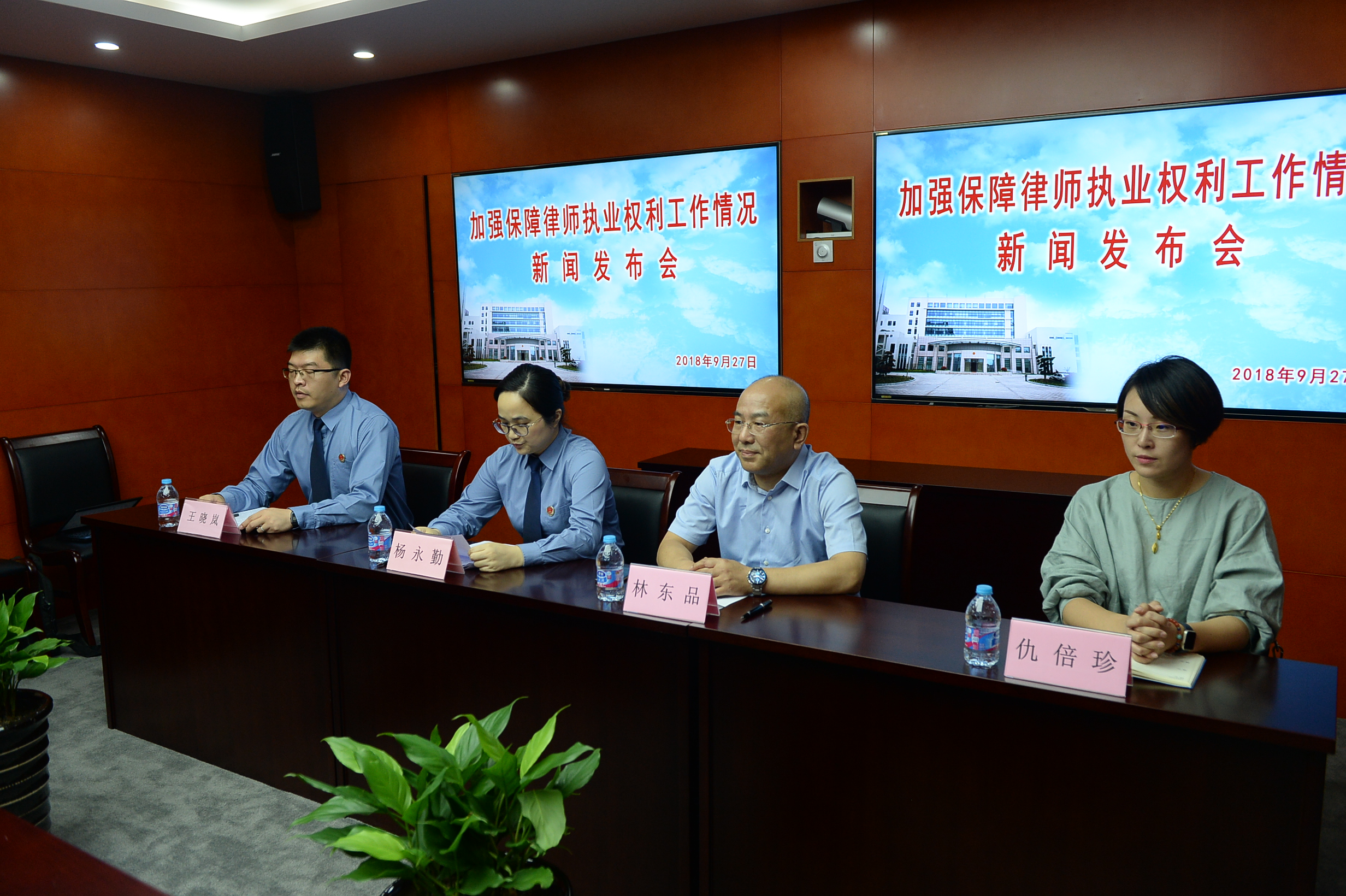 9月27日,三方在徐匯區檢察院召開共同簽署《備忘錄》的新聞發布會。市律協維護律師執業權利委員會主任林東品與徐匯區檢察院副檢察長楊永勤、檢察六部主任王曉嵐,徐匯區司法局律公科負責人仇倍珍一同出席。