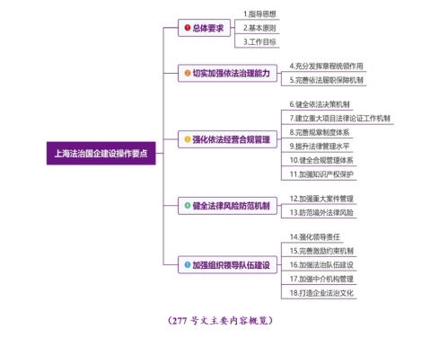 通覽277號文,它從五個方面共十八項內容(其中第一項至第三項分別為全面推進上海法治國企建設的指導思想、基本原則和工作目標,對企業的具體要求主要是第四項至第十八項)對上海國企的法治建設工作提出要求,并指出各企業應根據277號文的各項要求,結合本企業法治工作實際,對各項重點任務進行分解和細化,并逐項研究提出落實措施,明確時間節點和工作責任。