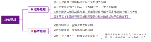 277號文就全面推進上海法治國企建設提出的總體要求包括指導思想、基本原則和工作目標三個方面。其中,指導思想和基本原則總結如下: