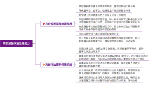 根據277號文,上海國企在切實加強依法治理能力方面應充分發揮章程統領作用并完善依法履職保障機制,具體要求如下: