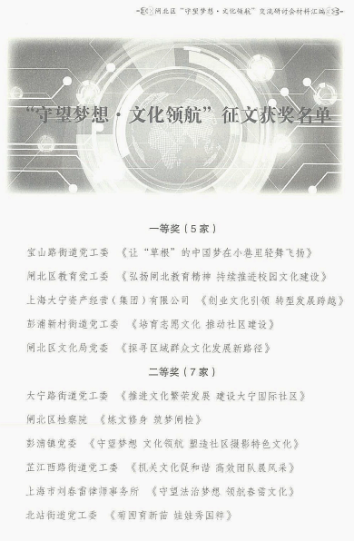 與會人員圍繞“以文化為載體,推進新形勢下思想政治工作”的主題,展開深入探討和交流。會議表彰了在閘北區“守望夢想·文化領航”征文賽中獲獎的單位。經逐級推選和評委會評定,共有50余篇征文參與最終角逐。劉春雷所撰寫的《守望法治夢想,領航春雷文化》榮獲二等獎。