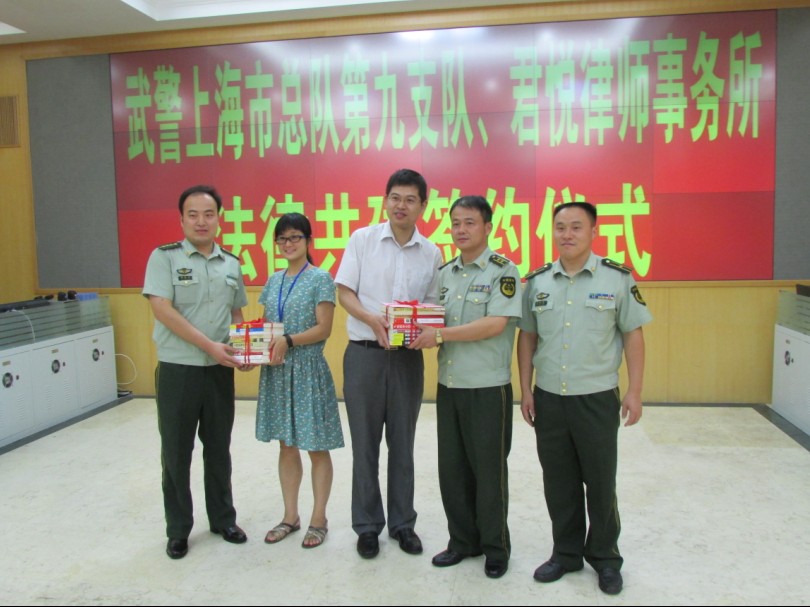 近日 ,君悅律師事務所合伙人楊飛翔律師、黨支部書記葉沂萌律師等和長寧區司法局代表前往武警上海總隊九支隊,出席并簽署“警民共建協議書”簽約儀式,并向部隊官兵贈送了各類法律書籍和普法宣傳冊60套。