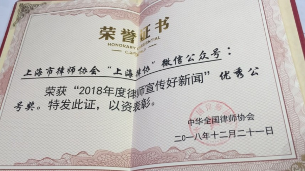 “上海律協”微信公眾號獲中華全國律師協會“2018年度‘律師宣傳好新聞’優秀公號獎”。