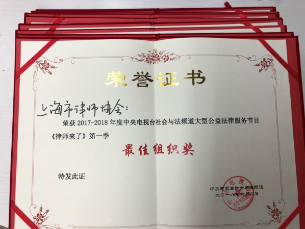 上海市律師協會獲央視“律師來了”節目組頒發的“最佳組織獎”,上海共有1名律師獲“節目杰出貢獻獎”,2名律師獲“最佳公益代理獎”,7名律師獲“最佳公益獎”,13位律師獲“優秀法律顧問獎”。
