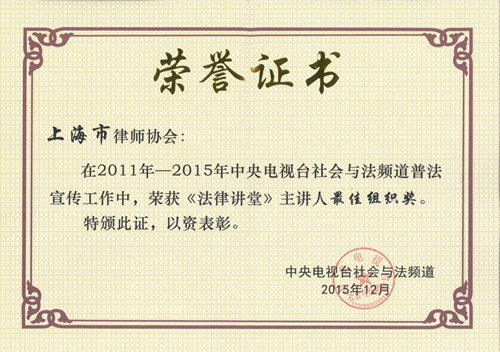 在2015-2016《法律講堂》欄目年度總結(jié)會議中,中央電視臺《法律講堂》欄目與中華全國律師協(xié)會簽署備忘錄。上海市律師協(xié)會榮獲《法律講堂》主講人最佳組織獎。欄目主講人楊波律師獲得“最佳表率獎”、“最高收視提升獎”、“最高出境獎”3個個人獎項、郝紅穎律師獲得“最佳進(jìn)步獎”。隨后,兩人相繼作為主講人代表在大會發(fā)言。應(yīng)朝陽、閆艷律師也作為上海律師主講人參加會議。