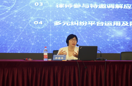 孫彬彬主任作為講師進行了第一場課程《境內外律師調解業務情況綜述》的講授。孫主任從律師在調解中的定位、律師調解之工作機制及程序、律師參與調解情況概述、境外調解制度綜述四個方面進行講解。孫主任表示,調解具有自愿性、靈活性、便捷性和保密性等四大優勢,律師具有無可替代的專業性、職能性和獨立性,應當在大調解格局中發揮重要作用。與此同時,律師作為調解員與作為代理人的視角存在較大差異,在身份轉變的同時,對于自身的中立立場、保密義務、調解技能和調解程序要有更為清晰的了解和認識。