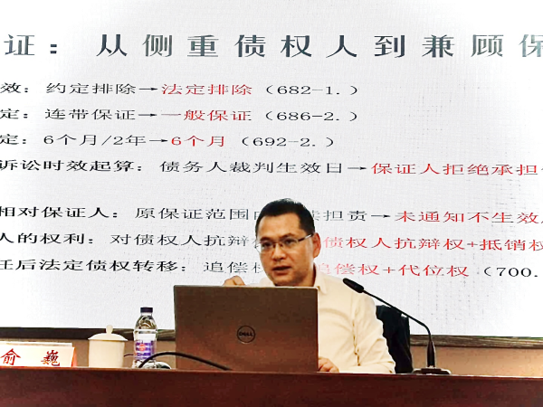 俞巍副院長就法人制度和行為效力、公司解散清算、合同效力、合同的解除、擔保規則及追償等企業運營中重點問題,結合案例,系統梳理和剖析了民法典、九民紀要、合同法、公司法等法條的異同,理論與實踐充分結合,枯燥的法條經過深入淺出的分析加深了參訓人員的理解和認識,得以更好地活學活用民法典。公司律師和企業法務們濟濟一堂,培訓持續了整整三個小時,結束時大家仍意猶未盡,深感學無止境、受益匪淺。