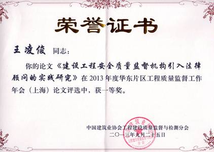 會上,揭曉了華東區(qū)工程質(zhì)量監(jiān)督工作年會參會論文評選結(jié)果,建領(lǐng)城達(dá)律師事務(wù)所王凌俊律師撰寫的《建設(shè)工程安全質(zhì)量監(jiān)督機(jī)構(gòu)引入法律顧問的實(shí)踐研究》榮獲年會論文一等獎。