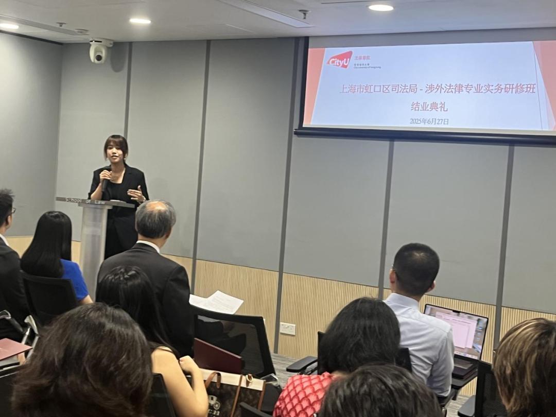 香港城市大學法律學院院長林峰教授、副院長丁春艷教授出席儀式,由助理教授陳揚主持儀式。林峰教授在致辭中強調:“本次培訓首次為虹口區的法律人才自虹口司法局與香港城市大學達成合作后的第一次深度鏈接交流,在課程磨合以及學員的配合度上均為流暢,講師教授們也對本次的活動有著極高的評價,希望在后續的活動中還能與虹口區的法律人才和城市大學多多建立合作。”