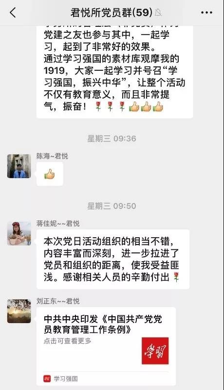 影片結束后,主題黨日活動正式結束,此次主題黨日活動內容豐富、形式莊重,體現了君悅對黨建活動的一貫高度重視,也體現了黨員積極參與的熱情。這次活動無論對于黨員還是非黨員,都是一次現實、生動、意義非凡的愛國主義教育。