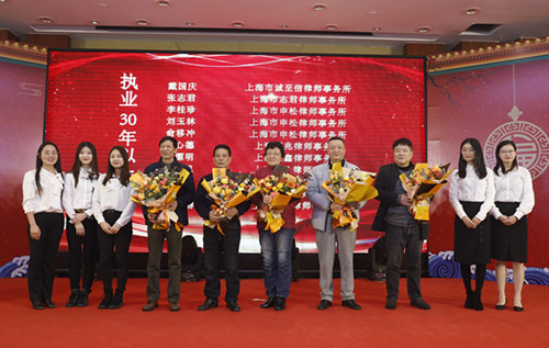 會上,年輕律師為到場的執業滿30年以上律師獻上了鮮花,感謝他們在松江區律師行業發展中披荊斬棘,開啟了今天松江律師行業欣欣向榮的局面,向他們表達了對最深切的敬意。松江區司法局歷任分管領導、律公科科長和律工委主任也蒞臨會場,觀看表演。