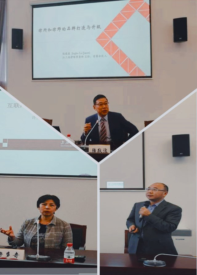 26日上午,上海江三角律所主任陸敬波律師講解《律所和律師的品牌》,陸律師從品牌的價值、品牌的定位、品牌的打磨等方面闡述了律所與律師需要注重品牌塑造;下午,上海交通大學法學院許多奇教授講授《互聯網金融的特性及監管》,許教授理論聯系實際,全面分析了互聯網金融的歷史階段、特性、監管、專項整治等問題;浙江天冊律師事務所羅云律師講述《如何打造精品知識產權案件》,他以自己辦理的經典案例及社會熱點案例入手,形象生動、幽默風趣地講解了律師如何打造精品案件以及實現專業化的基本過程。