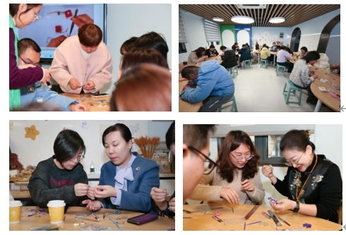 隨后進入實操環節,現場活動氣氛達到高潮。女律師與特殊青少年們分組圍坐,在彭老師的耐心指導下,共同開啟盤扣制作之旅。穿線、塑形、固定,每一個步驟都充滿挑戰,但大家相互交流、彼此幫助,女律師們憑借耐心與細心與懷著新奇與熱情的特殊青少年們共同攻克難關,大家在輕松愉悅的氛圍中逐漸熟練掌握了盤扣制作的核心技巧。