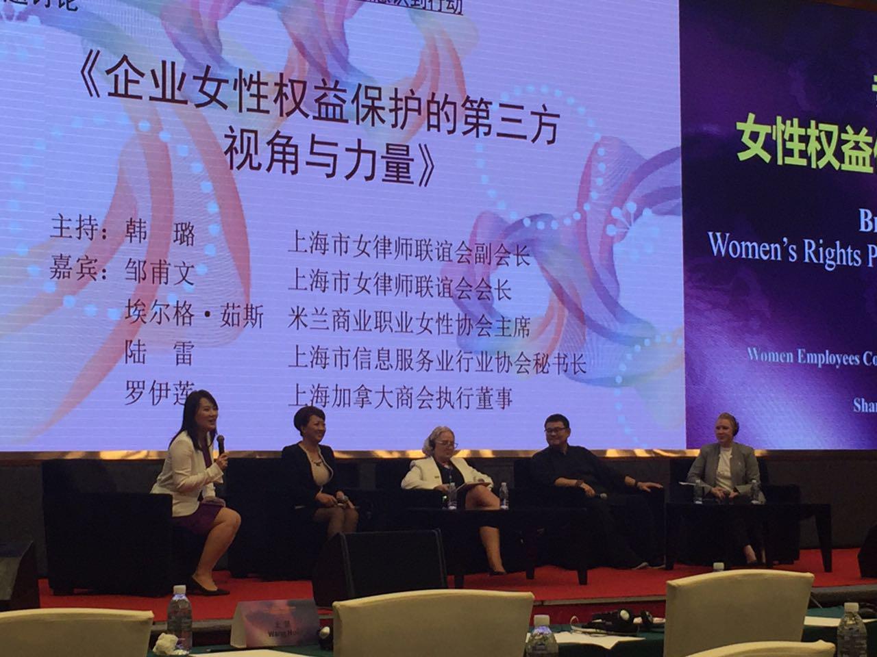進入專題討論環節,由市女律聯副會長韓璐主持,市女律聯會長鄒甫文、米蘭商業職業女性協會主席埃爾格·茹斯女士、上海市信息服務業行業協會秘書長陸雷先生、上海加拿大商會執行董事羅伊蓮女士作為討論嘉賓,從《企業女性權益保護的第三方視角與力量》為切入點展開討論。