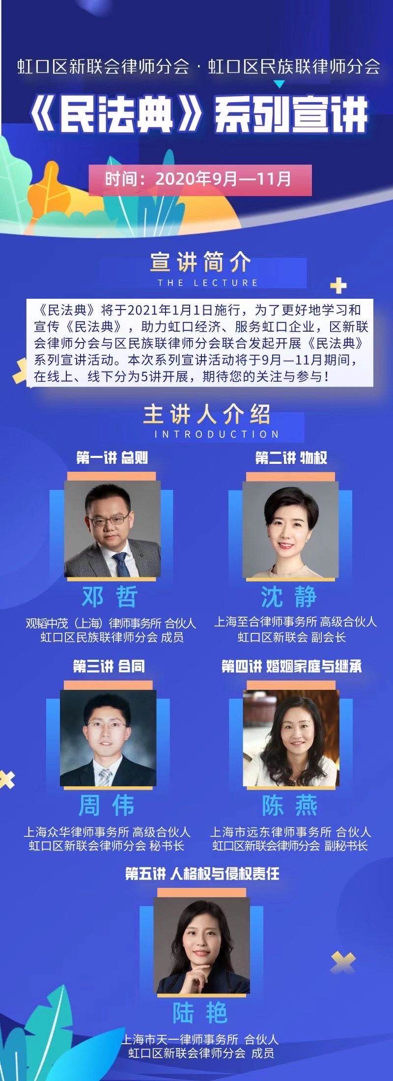 5位主講律師均為虹口區新聯會律師分會及民族聯律師分會的會員,也是虹口區相關律師事務所的主任或合伙 人,具有深厚的法律理論功底及豐富的實務經驗,本次宣講活動也將充分展示虹口律師的專業能力和職業風采。