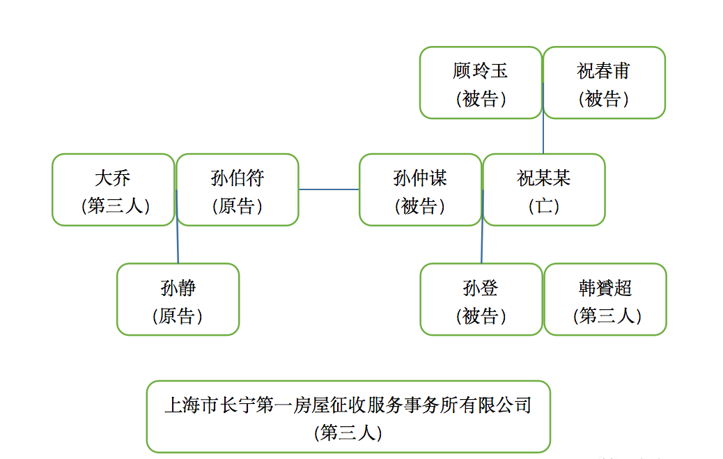 人物關(guān)系:孫伯符與大喬系夫妻關(guān)系,孫靜系其女兒;孫仲謀系孫伯符之弟,孫仲謀、祝某某系夫妻關(guān)系,孫登系其兒子;孫登與韓贇超于2013年2月18日登記結(jié)婚。祝某某于2014年6月3日病亡,未留下遺囑。祝春甫、顧玲玉系祝某某的父母。2013年該房屋被征收時(shí),在冊(cè)戶口共有:孫仲謀、祝某某、孫登、孫伯符、孫靜五人。